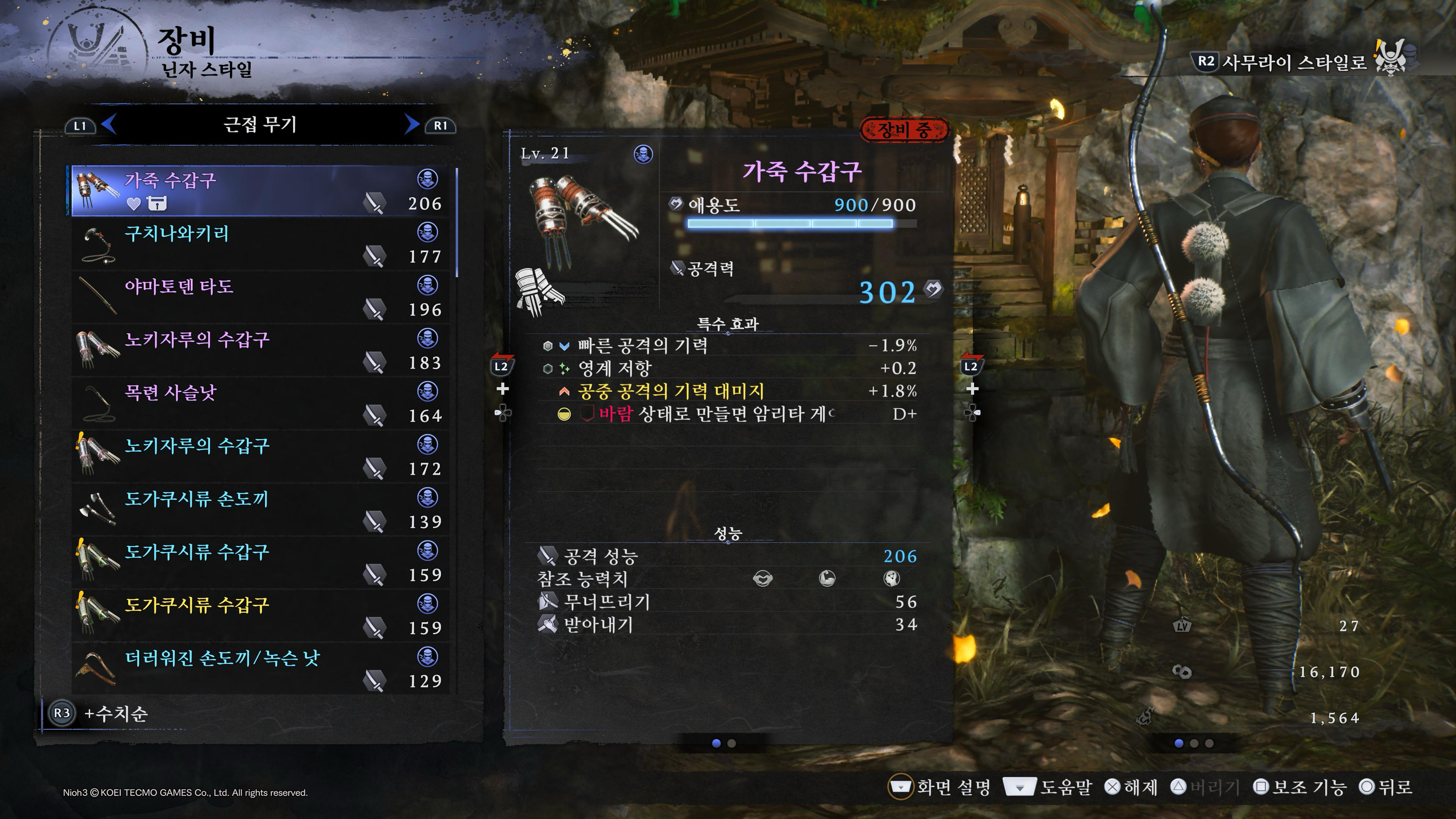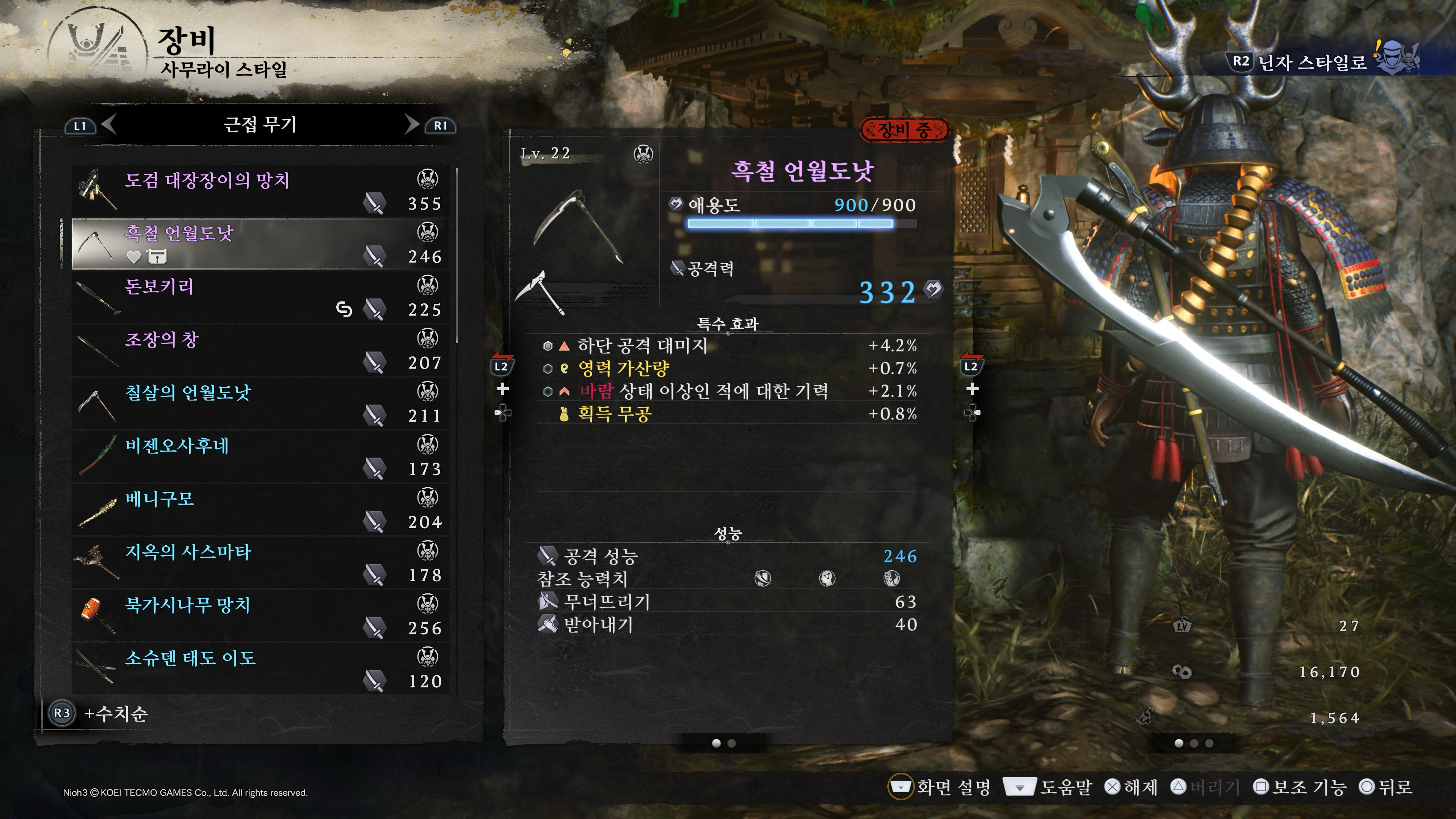 인왕3는 무기가 아주 많습니다. 사무라이, 닌자 스타일마다 무기가 7종씩, 총 14종입니다.