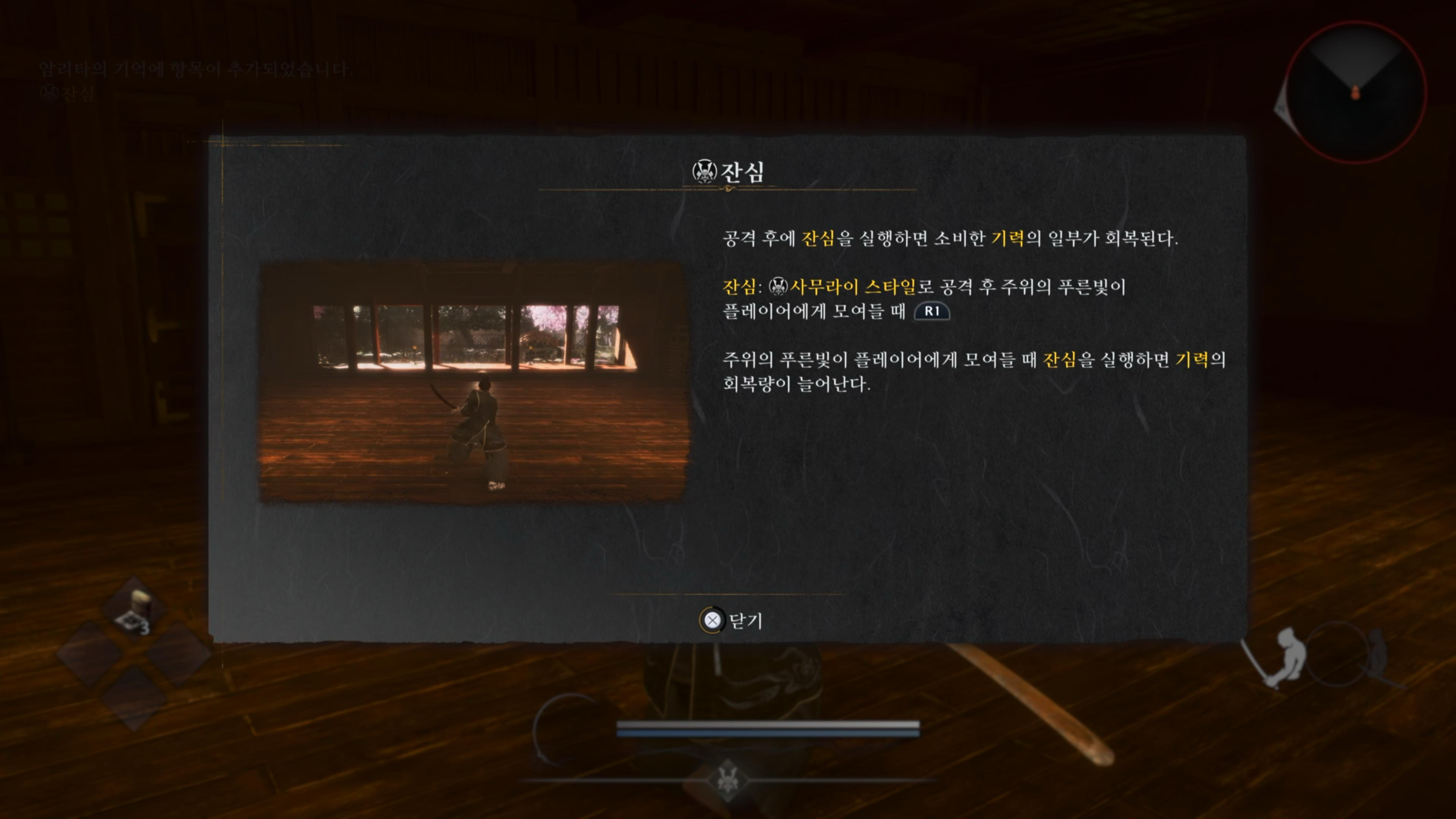사무라이는 공격한 뒤, 기력을 다시 채우는 잔심(R1)에 익숙해 지는게 정말 중요한데, 하다보면 익숙해 질 겁니다.